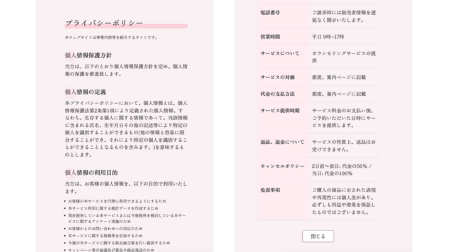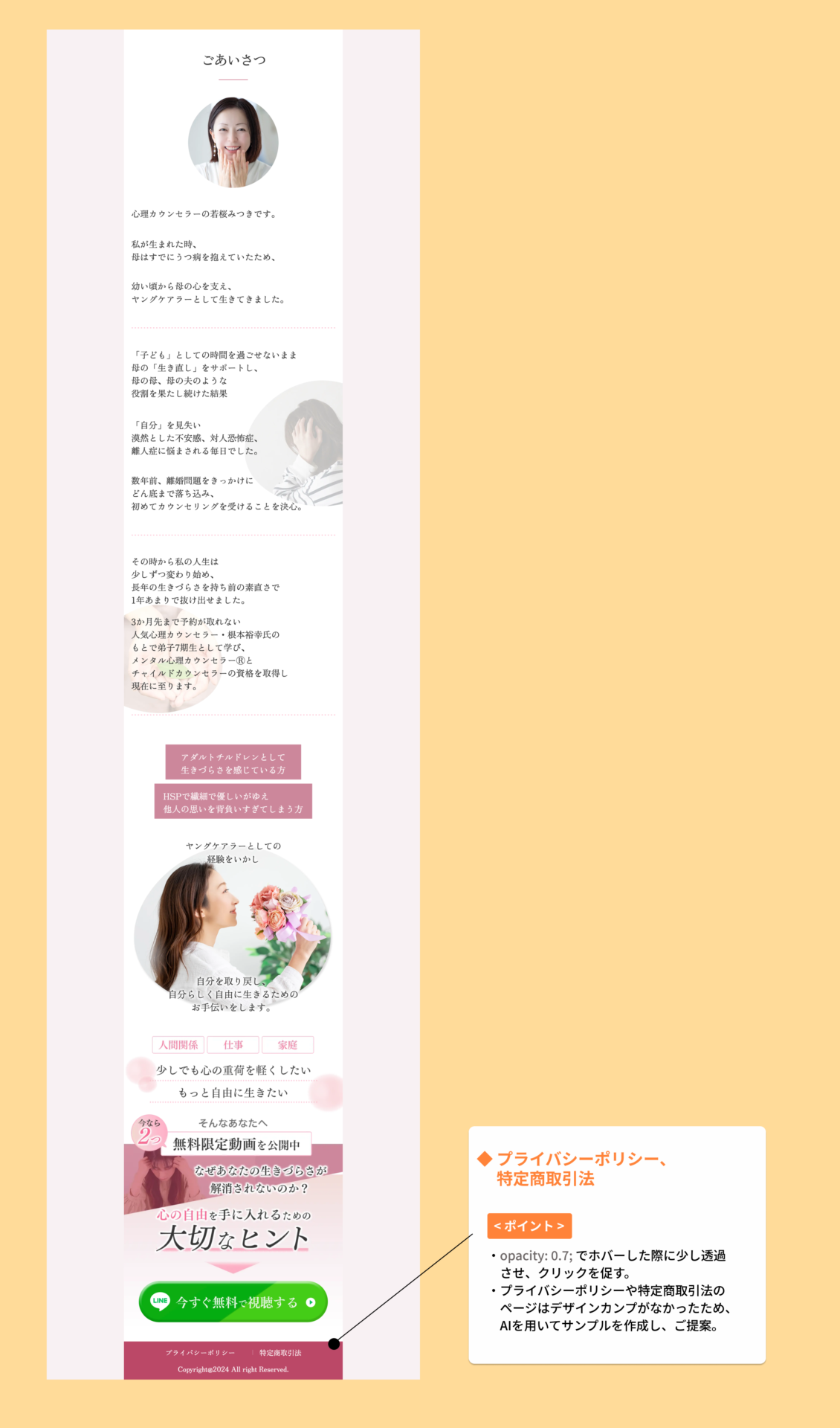 タイトルやディスクリプション案をAIを用いて作成し、ご提案。デザインカンプがなかったプライバシーポリシーと特定商取引法に基づく表示のページもサンプルを作成してご提案し、採用いただきました。