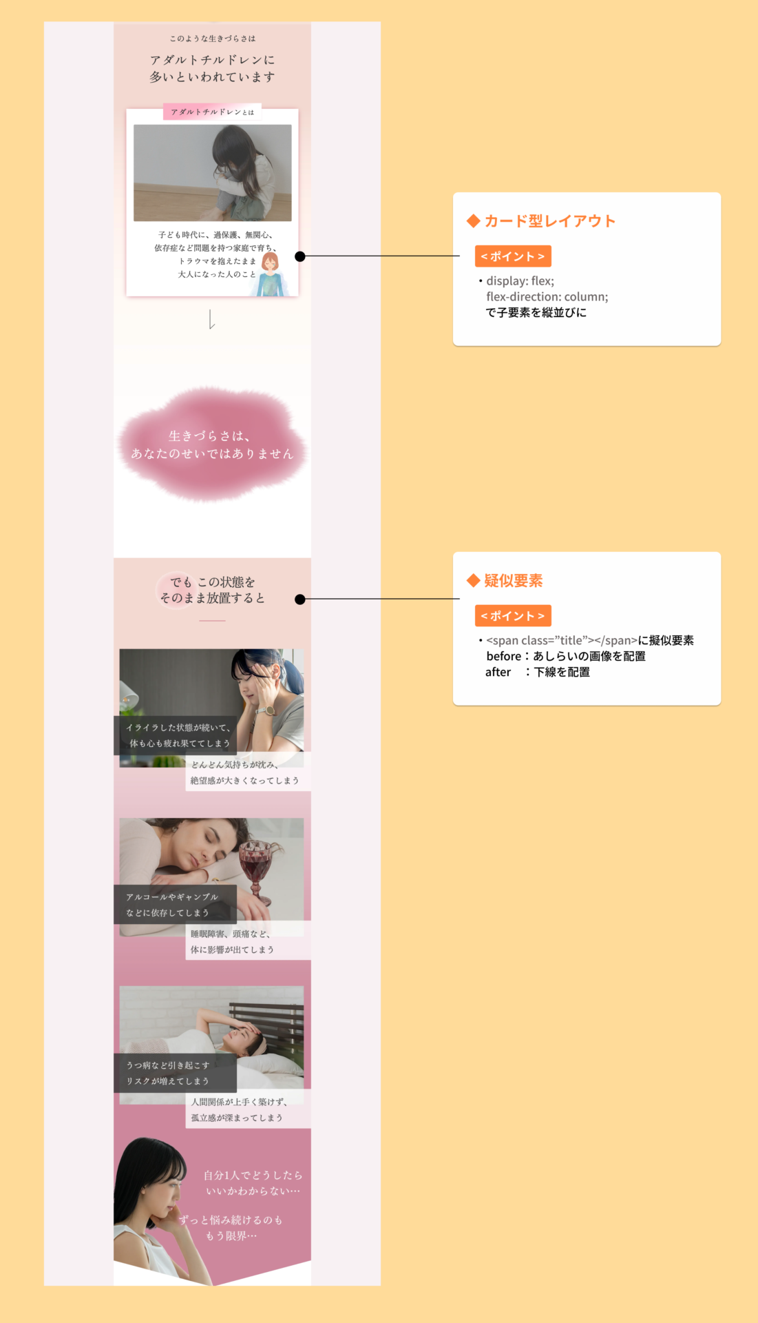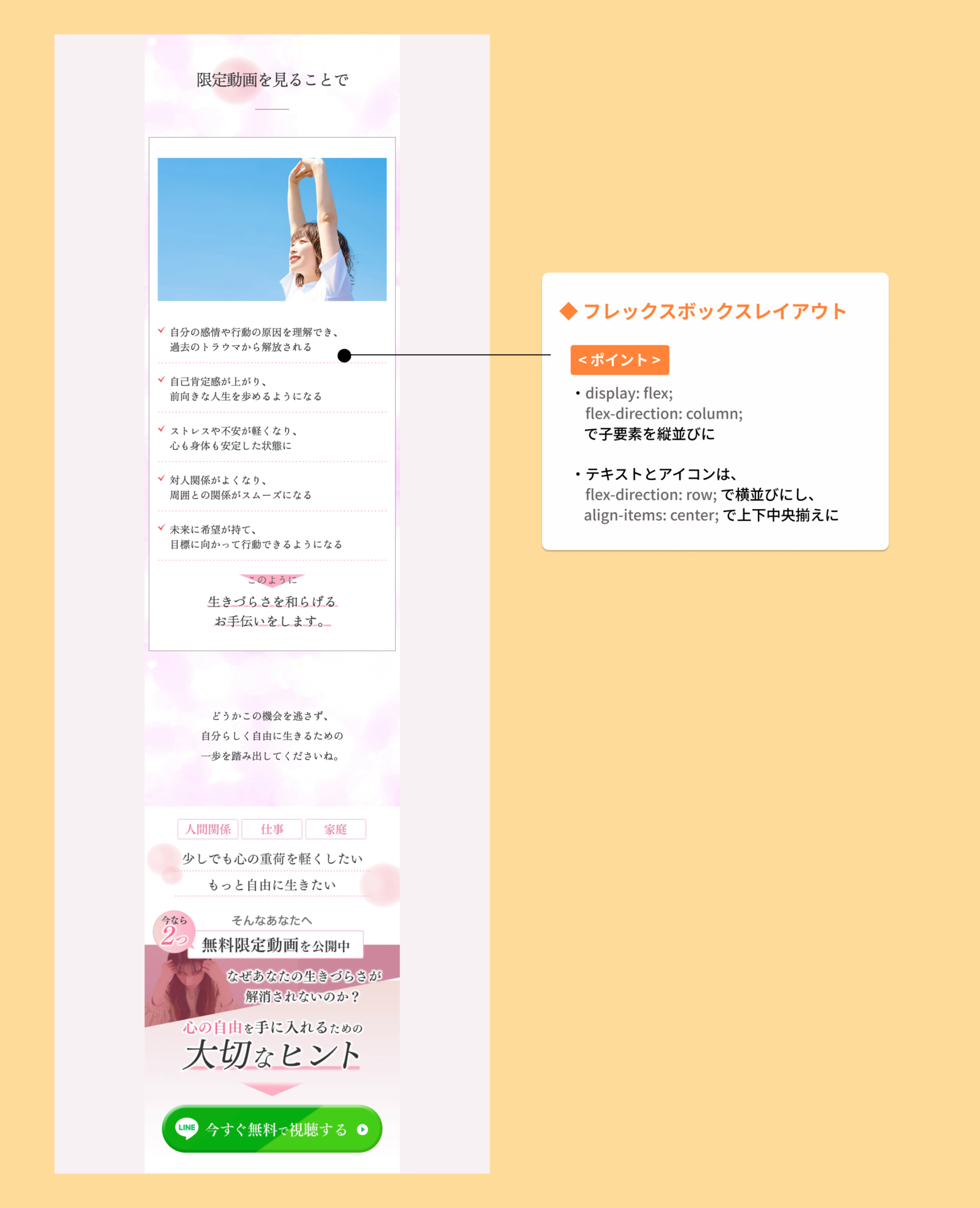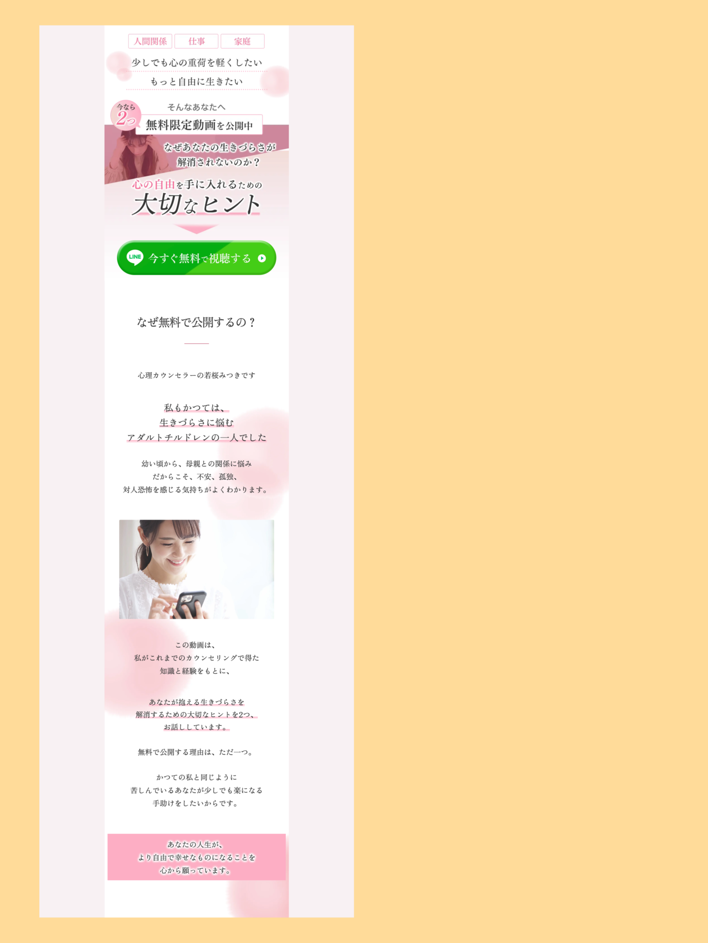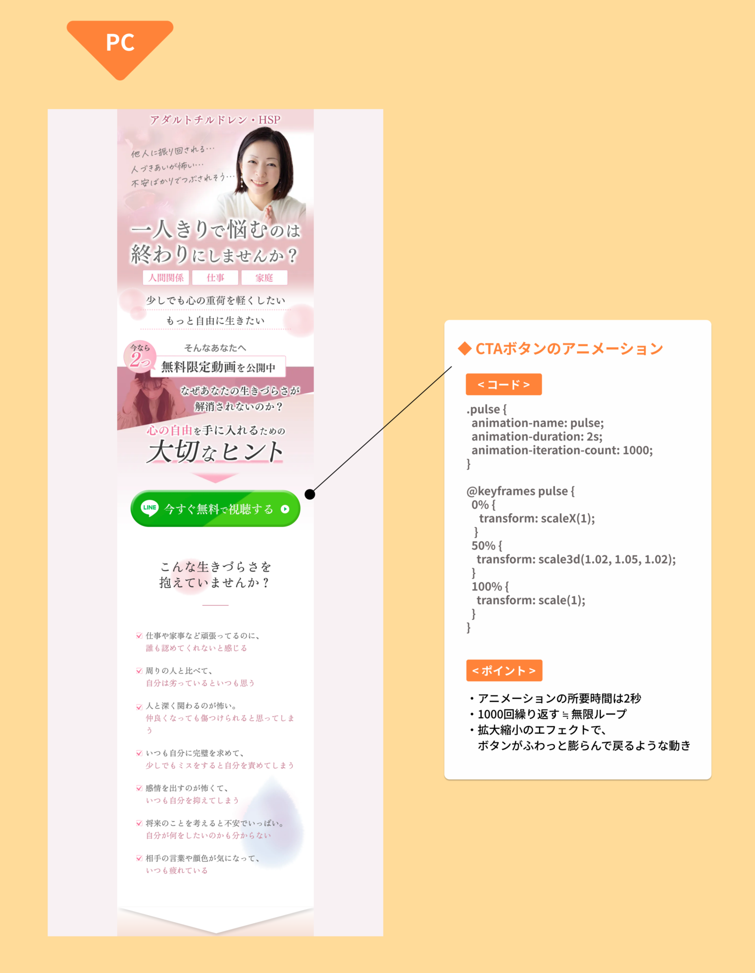 keyframesを使用したアニメーション。心理カウンセリングのLPのため、「思わず押したくなる、でも目立ちすぎない動き」を意識しました。