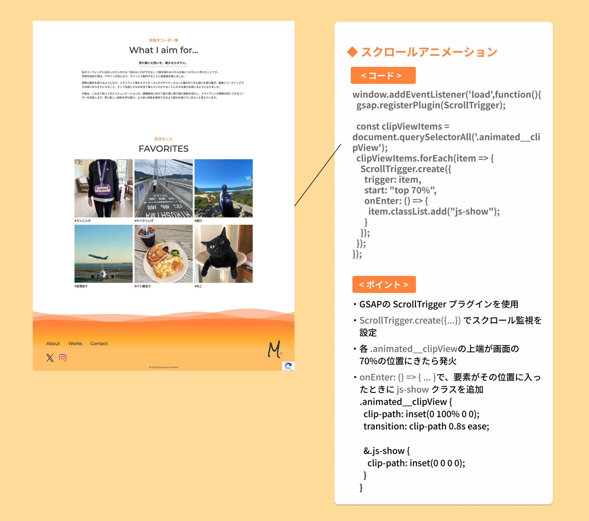 要素が上部から70%の位置で発火し、js-showのクラスに記載したopacity: 1が反映されるように実装しました。