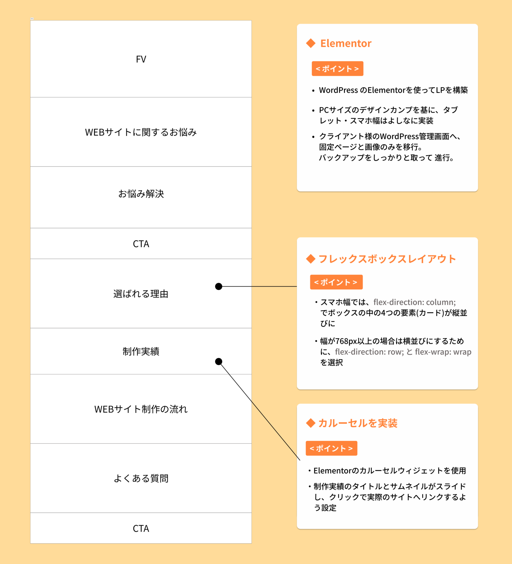基本はノーコードで、デザインを再現するために一部HTMLとCSSを追記しました。Elementorの知識がなかったため、Youtubeで基礎知識を入れた後に、Udemyを使って1日で実装の基礎を学びました。